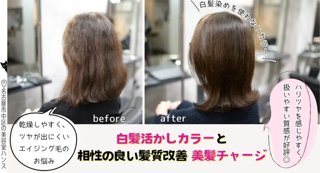 そんな方にこそおすすめしたいのが、白髪染めを使わないカラーと、 髪質改善 を組み合わせたケア重視の方法です。